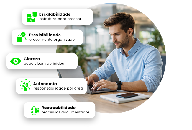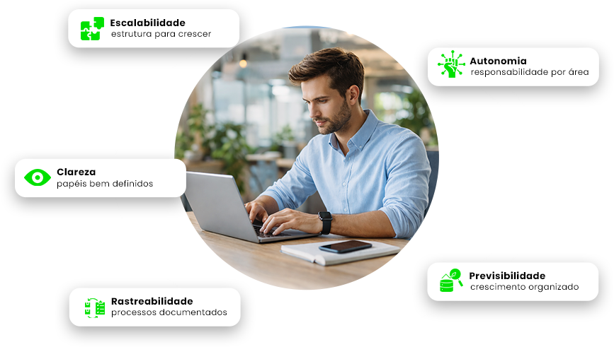 Para crescer de forma consistente, organizamos nosso trabalho com princípios que garantem autonomia entre as áreas, clareza nas responsabilidades e processos bem definidos.