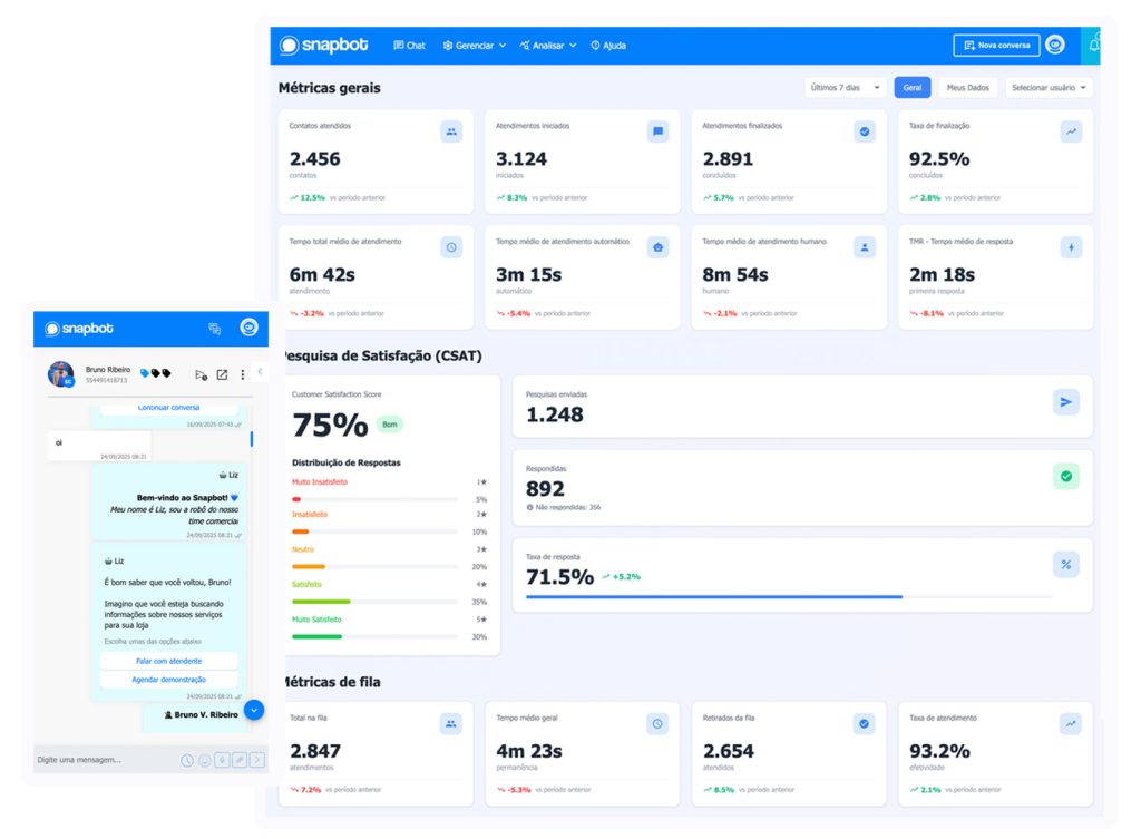 A Snapbot é uma plataforma poderosa e intuitiva que transforma a operação de atendimento no WhatsApp.Com métricas em tempo real, controle e gestão de filas, gerenciamento de equipes e integrações externas, você tem visão total da operação enquanto a automação cuida do volume.