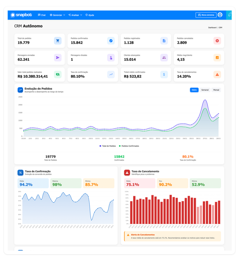 Com dashboards incríveis, você tem visões claras e insights estratégicos sobre toda a operação, entendendo comportamento, desempenho e oportunidades em tempo real.